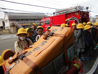 京都市内で起こった火事の件数や,火事が起きた時にはどうすればよいか,そして消防車はどのような仕組みになっているのかについて話を聞いたり,目で見たりして学習しました。