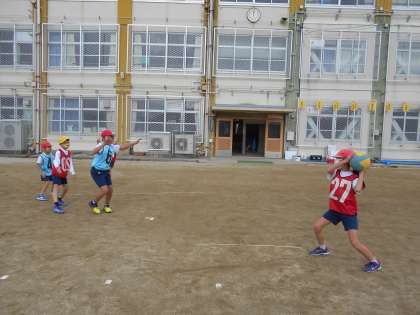 「ボールをよく見て受け取るとよいよ。」と自然にアドバイスし合ったり「ナイス!」と声をかけあったりしている姿が見られました。
