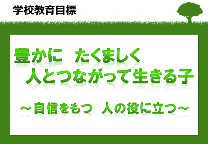 令和2年度の学校教育目標は,「豊かに たくましく 人とつながって生きる子 〜自信をもつ 人の役に立つ〜」です。川岡の子が,未来の主人公として社会を創り上げる姿を思い描いて設定しました。今後,さまざまな取組の中に,この学校教育目標を生かしていきたいと思います。