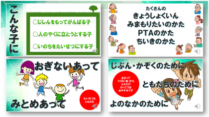 校長先生は,教職員のみなさんと話し合って,川岡の子はこんな子に育ってほしいという願いをまとめました。「自信をもってがんばる子」「人の役に立とうとする子」「いのちを大切にする子」です。そのために,自分には何ができるかな,と考えてくださいね。