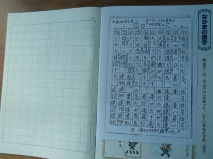 オコジョの表紙が漢字ドリル用のノートです。日付け,ドリル番号,を書いて,ていねいに書き写しましょう。読みがなもわすれずに書きましょう。(書き方のお手本はノートの表紙のうらにのりではっておいてください。)どの行も一番下のマスまで書いて漢字をしっかり覚えましょうね。