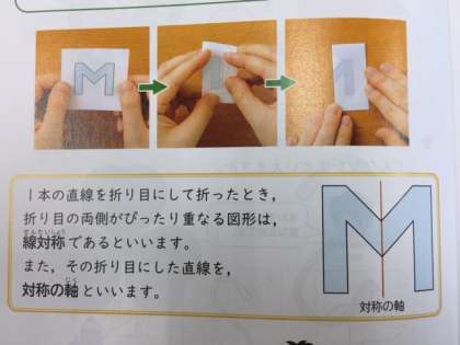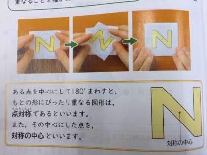 1本の直線を折り目として折ったとき,折り目の両側がぴったり重なる図形は線対称であるというんですね。また,ある点を中心にして180度まわすと,もとの形にぴったり重なる図形は,点対称であるというんですね。教科書のP14とP18にも載っているのでぜひ見ておいてくださいね。