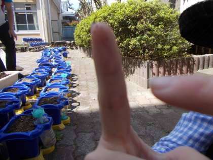 今日は,先生たち4人でみなさんが持ってきてくれた植木ばちに,ホウセンカのたねをうえました。ホウセンカがよくそだつように,みんなの植木ばちにひりょういとえいようのある土を入れました。