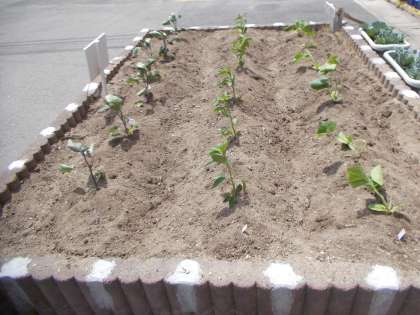 今日は,総合的な学習の京野菜を植えました。土をやわらくして,ひりょうをいっぱい入れて,うねを作り「賀茂茄子」「万願寺とうがらし」「鹿ケ谷かぼちゃ」のなえを植えました。登校日にかんさつしたいと思います。せいちょうが楽しみですね。