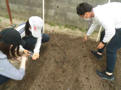 今日,ツルレイシのたねを植えました。時間をかけて草をぬき,畑をたがやして,ひりょうを入れて,土づくりをしてからのたねまきです。手間はかかりますが,何事も基本が大切ですよね。たねまきのポイントは,つめすぎず,50cmぐらい開けて植えることです。
