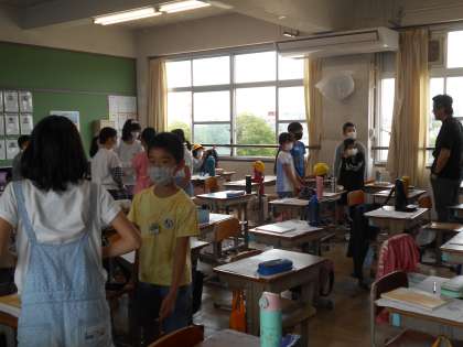 久しぶりに登校した子ども達は,少し戸惑い気味な様子の子もいましたが,先生や友達との再会にみんな嬉しそうでした。課題を提出したり,学習クイズをしたり,運動場で体を動かしたりして1時間があっという間だったようです。