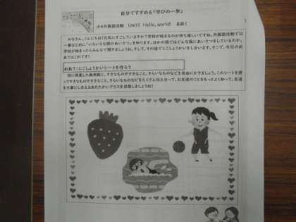 登校日に配る5月ワークシート(1組は本日配りました。)の1番最後のページに「外国語活動 じこしょうかいシートを作ろう」がとじてあります。配布した画用紙に好きなくだものや好きなこと,好きな色など,好きな○○を3つ絵でかいてください。(絵の上に年,組,名ぼ番号,名前をわすれず書きましょう。)川岡花子さんは,絵をかくこと,さくらんぼ,ピンク色が好きなので,それを表す絵をかきました。ラグビー,サッカー,野球が好きな人は,3つともスポーツでもいいし,ステーキ,お寿司,カレーが好きな人は3つとも食べ物でもいいです。