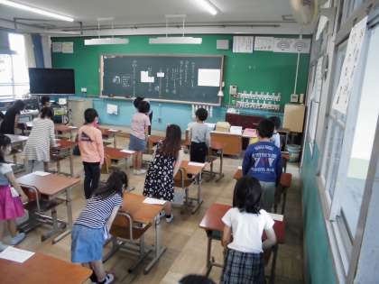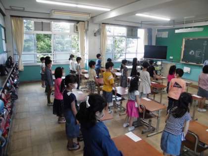 はじめに,健康観察をしました。次に,先生からの話を聞いて,もらったプリントを片付けました。その後は,2つのグループに分かれて活動しました。「パプリカ」を踊ったり,クイズに答えたりして楽しみました。みんなで笑顔あふれる時間を過ごすことができてよかったです。
