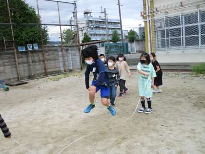 教室では学習や先生についてのクイズをしたり,運動場では大繩対決やジェスチャーゲームをしました。