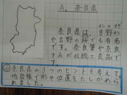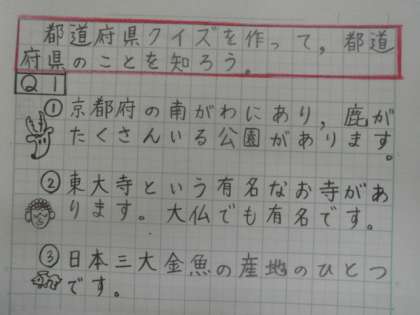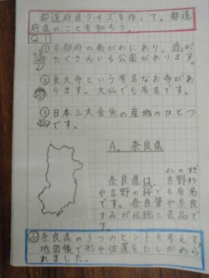 教室で都道府県クイズをした後,自分でクイズを作ってみようと,みんなでヒントになることを考えました。自分の知っていることからヒントにできるかな?「京都府の近くで,鹿がたくさんいる県です。」「東大寺という有名なお寺があります。」など,友達のヒントにつないで発表してくれました。自主学習でもどんどん都道府県クイズを作ってみてください。作ったクイズを自学ノートにまとめるといいですね。1問につき1ページでできそうです。チャレンジしてみましょう!