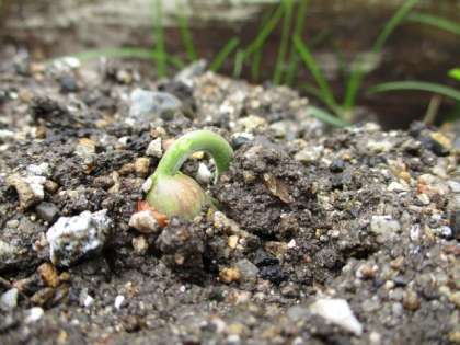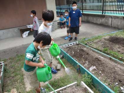 みんなで発芽したインゲン豆やポップコーンの芽に水をあげました。