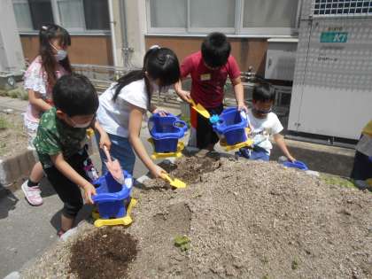 今日は一人ひとりの植木鉢に野菜の苗を植えるための準備をしました。