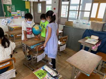 地球儀を見ながら,世界の様子について気付いたことやわかることを交流しました。