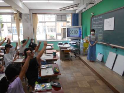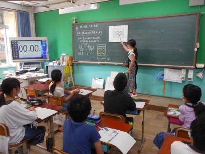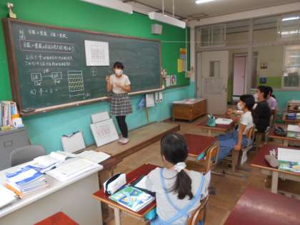 分数×整数の計算の方法を図を使って説明しました。図を使うととても分かりやすいことが分かりました。自分の考えをホワイトボードを使ったり,黒板に図をかいたりしながら説明ができるように頑張っています。