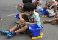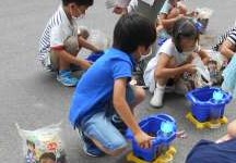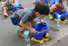 そして そとで つちを うえきばちにいれたり,おみずをあげたりしながら あさがおの たねを まきました。