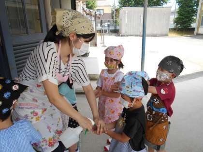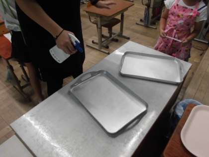 みんなが安心していただけるように,給食前後のおぼんや給食台などの消毒,手洗いの徹底,その上での当番の子(今週はみんな!)の手の消毒を行っています。