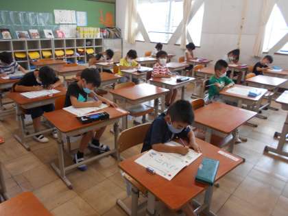 しょしゃの がくしゅうでは,しせいや えんぴつのもちかたに きをつけて きょうかしょのもじを なぞりました。