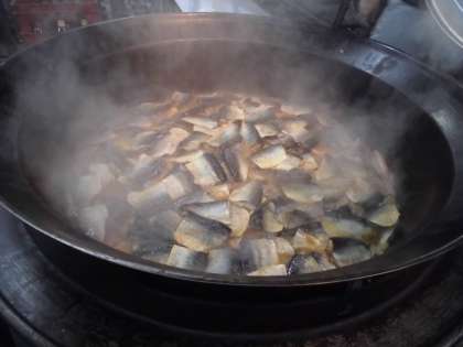 給食室では,大きな釜をゆっくり動かしながら,にしんをじっくり煮て作りました。