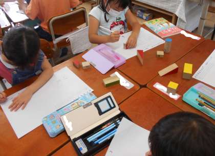 2くみは,さんすうで かたちをつかって えをかく がくしゅうをしていました。