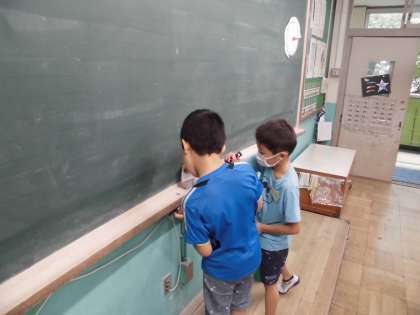 子ども達は,掃除時間の5分前から掃除を始めています。自分の分担場所の掃除手順を理解して一生懸命頑張っています。「1列目をひいてください。」などと声をかけあって協力して活動しています。