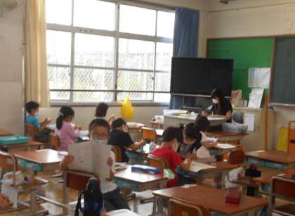 あめなので,きょうしつで すごしたり,としょしつに ほんをかりにいったりして すごしています。