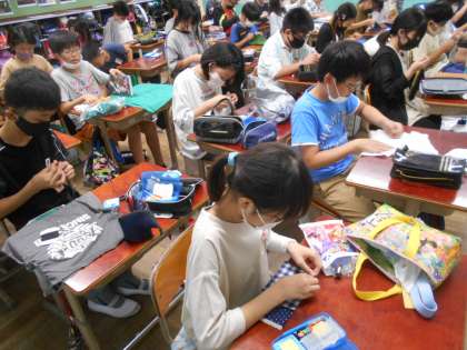 小さくてきれなくなった服や,いらなくなった布などを利用して生活に役立つ物を作っています。Tシャツがクッションに変わったり,エプロンに変わったりと一人一人が工夫して制作しています。どのような物ができるのか楽しみです。