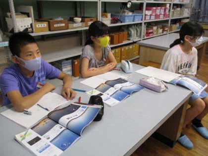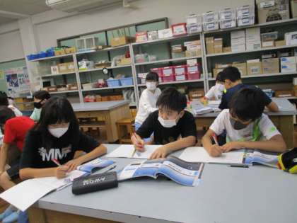 教科書の写真を見て,気づいたことを真剣に考えています。
