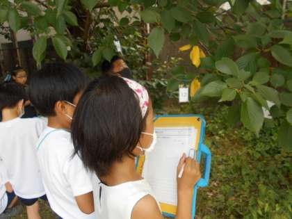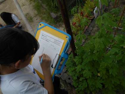 暑くなってきました。気温は34度です。運動場の桜の枝と,花壇のツルレイシを観察しました。ツルレイシの中には,この土日の休み中に,30センチくらいつるを伸ばしたものもありました。小さな実ができているのも発見しました。