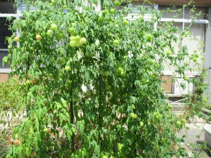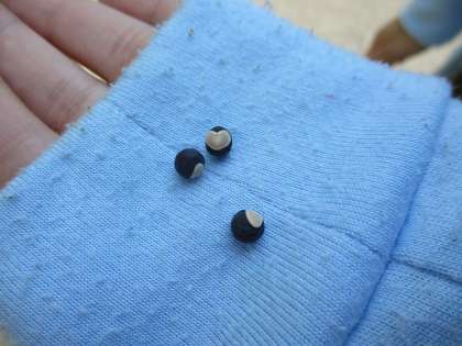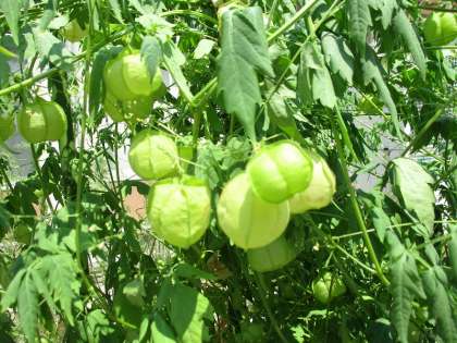 5がつに まいた ふうせんかずらが こんなに おおきく なりました。 ふんわりした ふくろの なかを みてみると,,,はあとの もようが はいった かわいい たねが 3つ でてきましたよ。