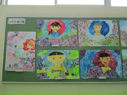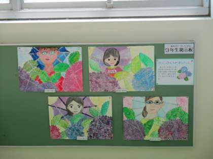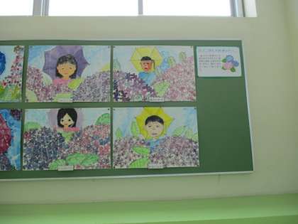 1学期に描いた「あじさいとわたし」の絵です。雨の中で,紫陽花を見ている自分を描きました。