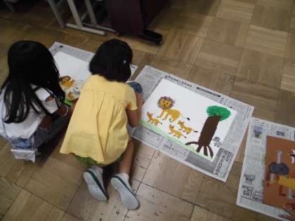 「ライオンの風をみた一日」の話を聞いてお気に入りの場面を想像して絵に表しています。今日は,下絵に絵の具で背景の色づけをしました。来週は,コンテで風を表します。どんな絵が仕上がるのか楽しみです。