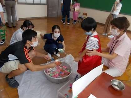 今日はたくさんの教職員もお客さんとして来てくださり,すごく嬉しい夏祭りになりました。「はぁ〜。楽しかったぁ。」と授業が終わったあと,子どもたちが感嘆の声を漏らしていました。