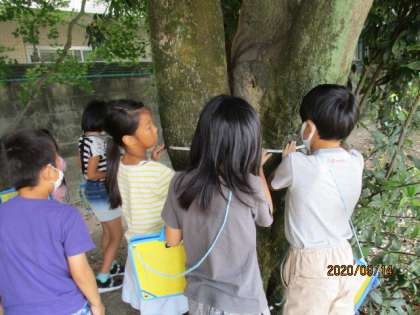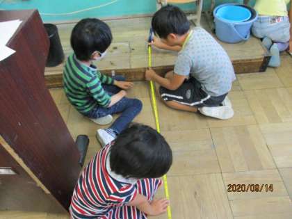 今日は,まきじゃくを使って,教室の縦と横の長さを測ったり,校庭の木のまわりの長さを測りました。