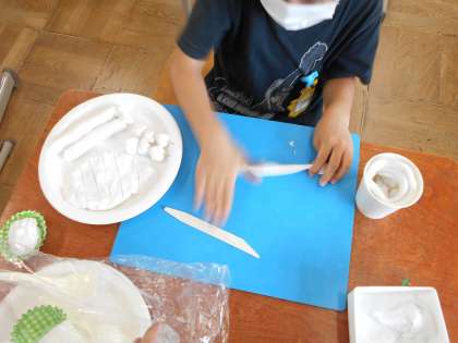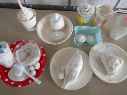 ずこうのがくしゅうで,ねんどをつかって ごちそうを つくりました。