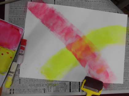 絵の具で色を作ってローラーで背景を描きました。自分のテーマに合わせてローラーの動きを考えました。斜めにしたり,カーブしたり・・・できた線を見て満足そうな表情をしていました。