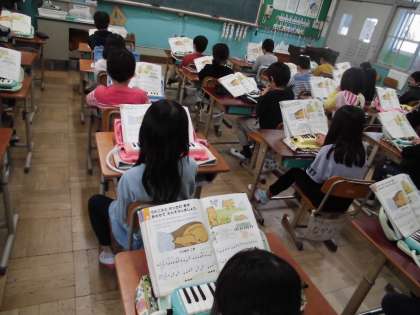 今までに学習した曲を演奏しています。タンギングや指づかいに気を付けて吹いていました。お互いに聴き合う場面では,楽しそうにリズムにのっていました。