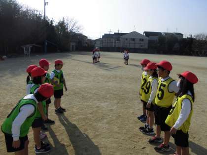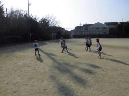 体育科でパスゲーム(2)をしています。パスゲーム(1)で学んだので,ルールや進め方はバッチリです。プレーヤーが全員得点を入れるとボーナスとして3点が追加されます。ボーナス得点が入るように工夫して運動していました。