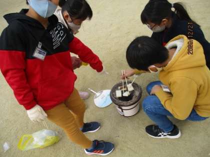 今日は,社会で学習した昔のくらしの体験で,七輪でお餅を焼いて食べました。子ども達は,炭がいこるまでは,時間がかかるのに驚いていました。感想では,「昔の人は料理するにもたいへんだったんだな。」「腰も痛くなってきました。」「炭で焼いたお餅は,レンジで焼いたお餅より,おいしかった。」など,昔の人は,家事がたいへんだったことに気づいいました。