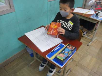 算数科「はこの形」で,持ってきた箱に白い紙をはりました。