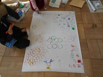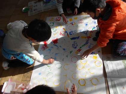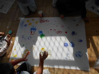 もってきたどうぐに えのぐをつけて スタンプのようにおすと・・