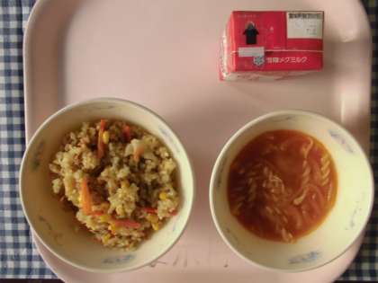 今日は,給食室で保管していたお米や乾燥野菜,缶詰などの食材を使って,「カレーピラフ」と「トマトスープ」を作りました。