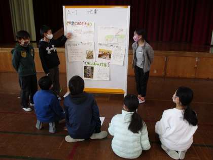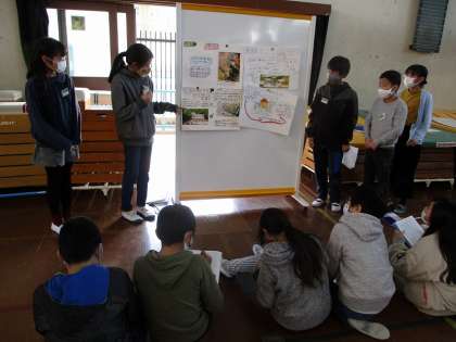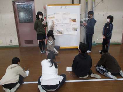 地震,津波,風水害,火山の噴火や大雪の4グループに分かれて,どのようにして自然災害が起こるのかや自然災害を防ぐための対策や取組について調べたことを,ポスターにまとめて発表し合いました。