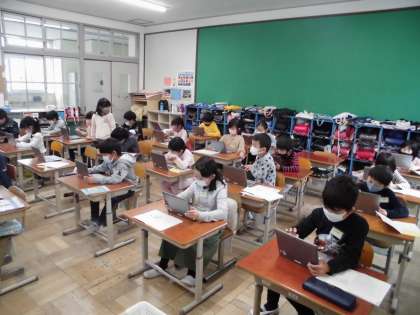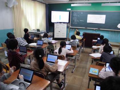 タブレットを使ってアンケートを実施しました。「すきな季節は?」「すきな食べ物は?」などの質問に対してタブレットで回答しました。テレビ画面に映し出された結果を見て,予想外の結果に驚きの声が上がっていました。