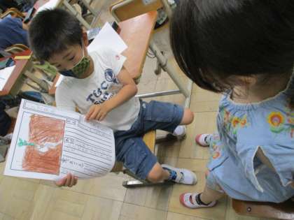 2年生は国語科の「たんぽぽのちえ」で学習した「ちえ」と「わけ」を,次は自分で,本で違う植物について調べました。そして調べたことをちえカードにまとめました。今日はその交流を行いました。ペアで交流したときは,ちえカードを友達に見せながら「ちえ」と「わけ」と「自分の思ったこと」を話しました。子どもたちは自分の調べた植物とは違う植物だったので,真剣に友達の話を聞いていました。感想もきちんと伝えていました。