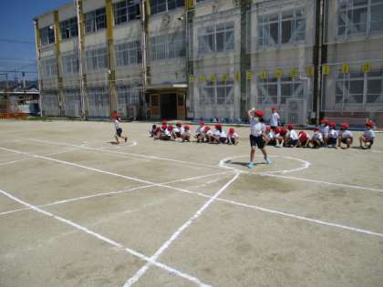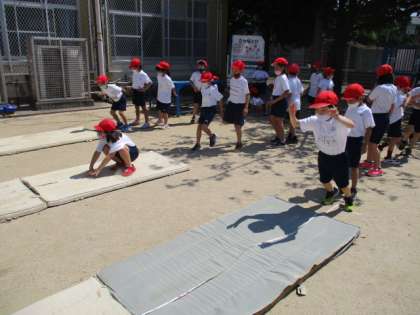 立ち幅跳びでは腕を大きく振って,反動を使って遠くまで跳ぼうとしている姿が見られました。また,友達に「頑張って〜!」や「お〜遠くまでいった〜!」などと応援している子もたくさんいて,嬉しくなりました。