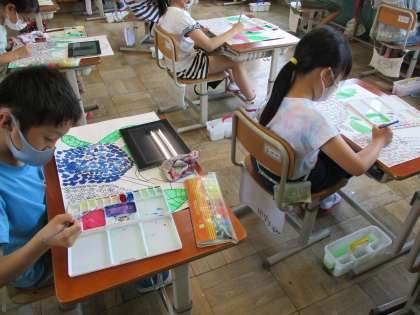図工の「あじさいとわたし」の学習であじさいの絵を描いています。