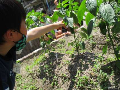 2年生の花壇に植えたピーマン,ナス,えだまめ,オクラが大きくなってきました。「ピーマンがスナップエンドウみたい。」や「ナスのくきや葉が黒っぽい。」など,新しい発見がたくさんありました。えだまめが垂れ下がって出来ていることにも驚いていました。そろそろ収穫しようと思います。