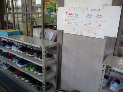 代表委員さんが中心になって,くつをそろえる声かけをしているのですが,なかなか改善できない日がありました。