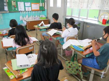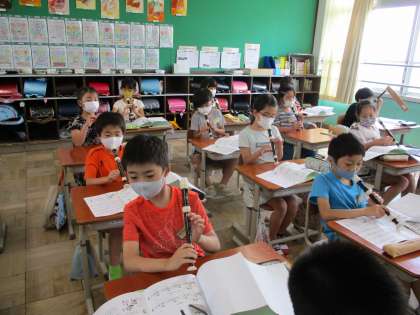 音楽ではリコーダーの学習を進めています。学校では実際に演奏できませんが,正しい指づかいで演奏できるように,指づかいを覚えています。シとラの指づかいを覚え,ソにも挑戦しています。いろいろな曲を演奏できるようになるのが楽しみですね。