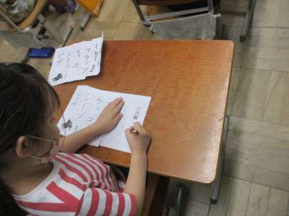 フェルトペンを使って,「マラソン・ラッコ・シーツ・ピザ」を書きました。止め・はね・はらいに気を付けたり,マスに合った文字の大きさに気を付けたりとゆっくり丁寧に書きました。また,カタカナの「ソとン」や「シとツ」はとても形が似ていて,子どもたちは書き順や形にも気を付けていました。